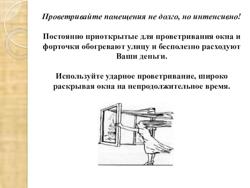 Проветривайте помещения не долго, но интенсивно!   Постоянно приоткрытые для проветривания окна и форточки обогревают улицу