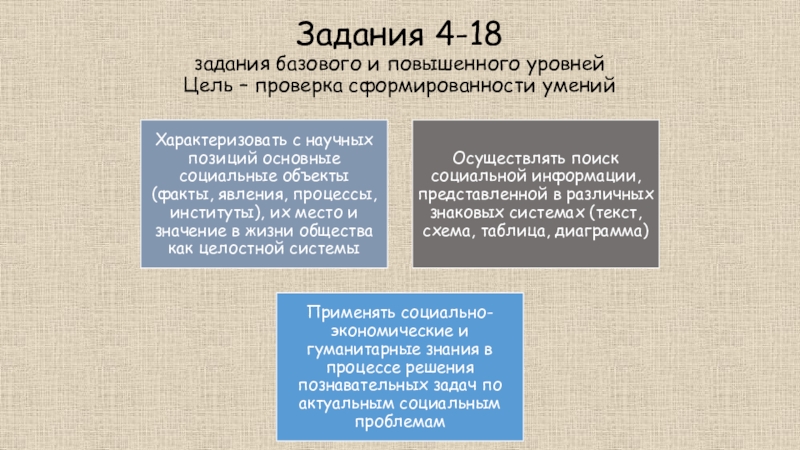 Слайд 9Задания 4-18 задания базового и повышенного уровней Цель – проверка сформированности умений