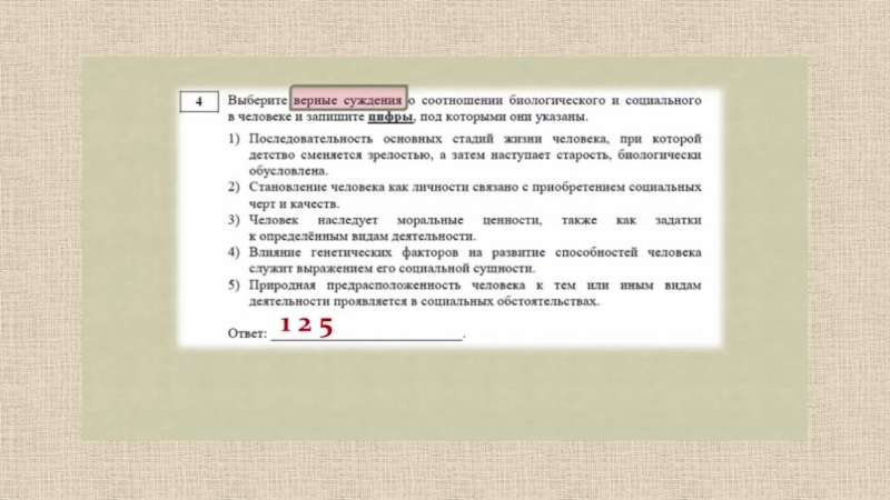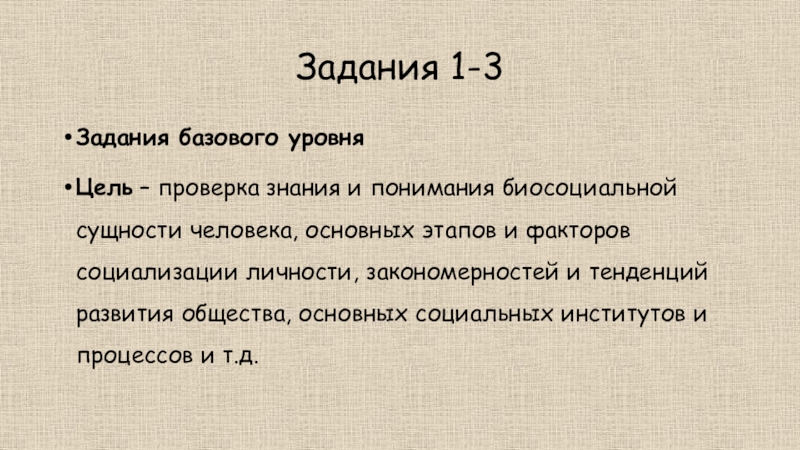 Задания 1-3Задания базового уровняЦель – проверка знания и понимания биосоциальной сущности человека, основных этапов и факторов социализации
