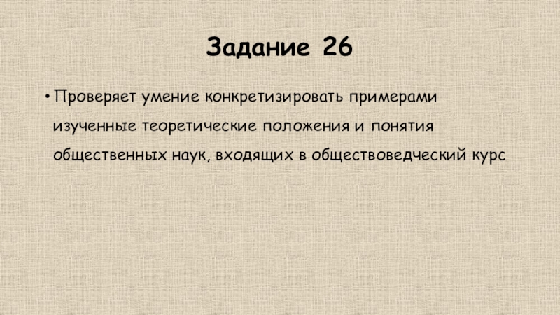 Задание 26Проверяет умение конкретизировать примерами изученные теоретические положения и понятия общественных наук, входящих в обществоведческий курс