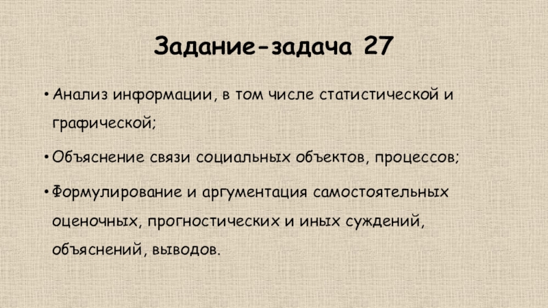 Задание-задача 27Анализ информации, в том числе статистической и графической;Объяснение связи социальных объектов, процессов;Формулирование и аргументация самостоятельных оценочных,