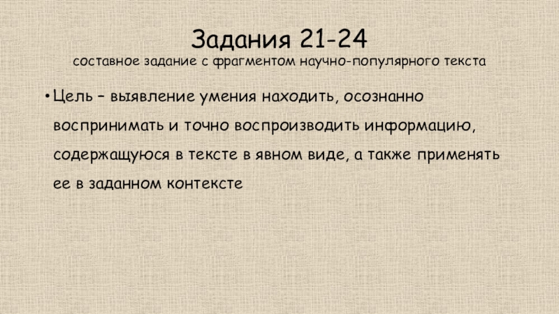 Задания 21-24 составное задание с фрагментом научно-популярного текстаЦель – выявление умения находить, осознанно воспринимать и точно воспроизводить