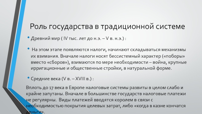 Вплоть до 17 века в Европе налоговые системы развиты в целом слабо и крайне запутаны. Вначале в большинстве государств налоговые платежи не регулярны. Виды платежей вводятся королем в связи с необходимостью покрытия целевых затрат, либо «когда в казне кончатся деньги».