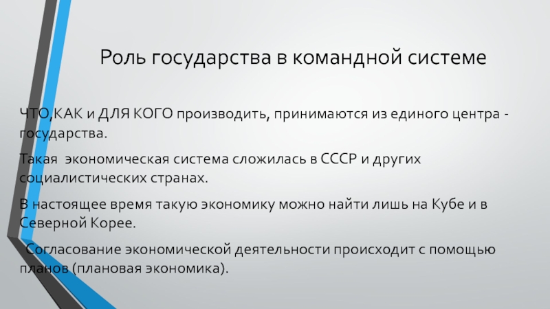 В настоящее время такую экономику можно найти лишь на Кубе и в Северной Корее.