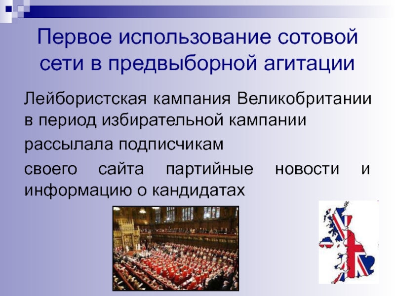 Слайд 38Первое использование сотовой сети в предвыборной агитации