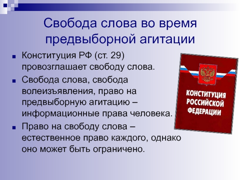 Слайд 20Свобода слова во время предвыборной агитации