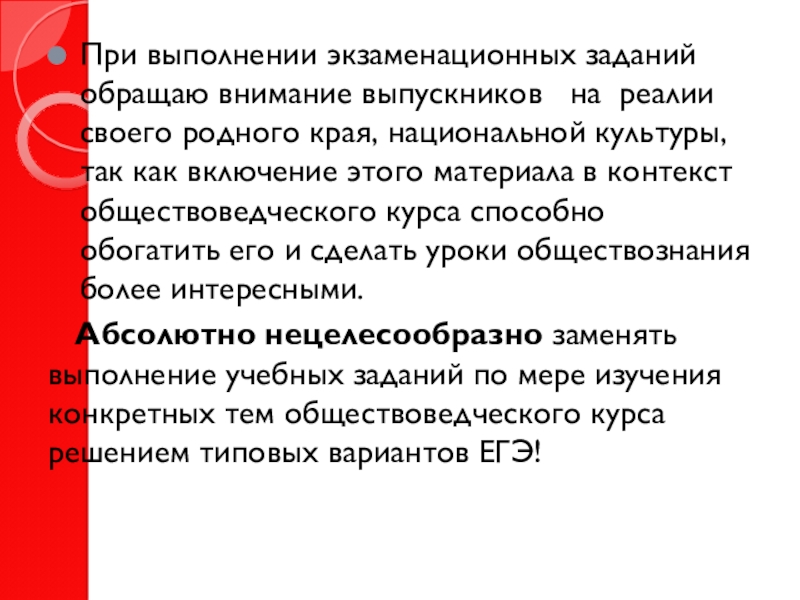 Слайд 13При выполнении экзаменационных заданий обращаю внимание выпускников на реалии своего