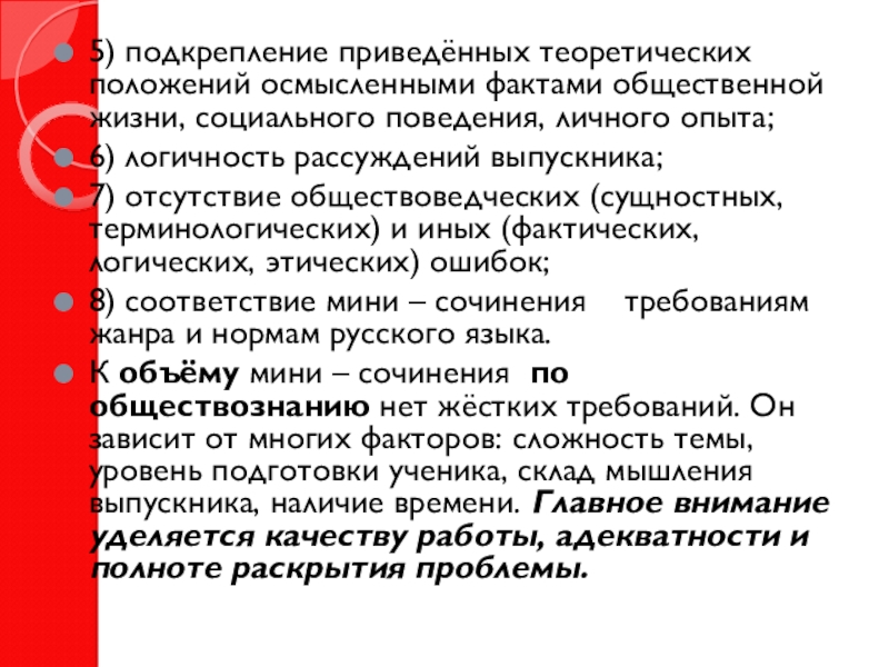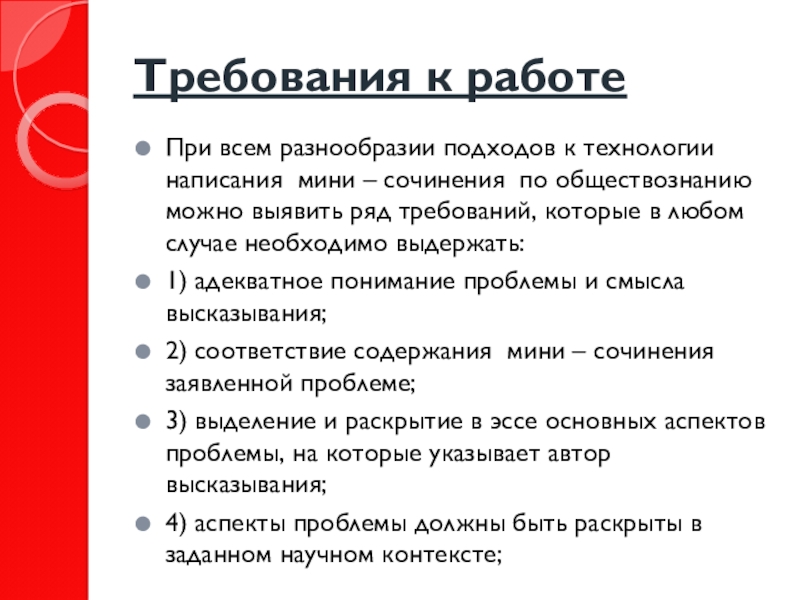 – сочинения по обществознанию можно выявить ряд требований, которые в любом случае необходимо выдержать: