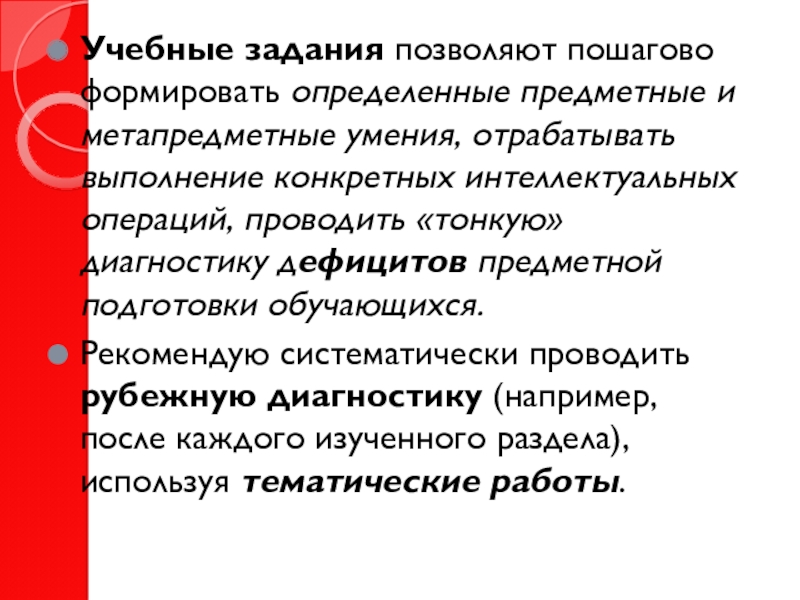 Слайд 14Учебные задания позволяют пошагово формировать определенные предметные и метапредметные умения, отрабатывать