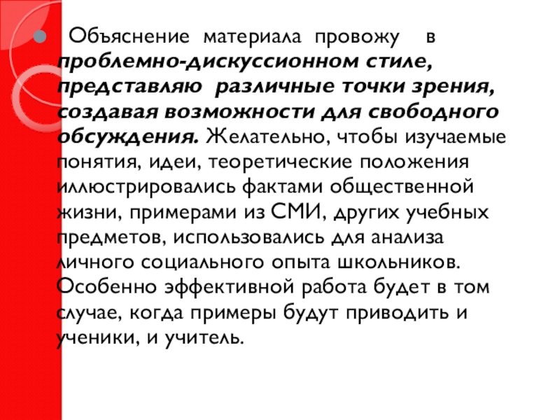 зрения, создавая возможности для свободного обсуждения. Желательно, чтобы изучаемые понятия, идеи, теоретические положения иллюстрировались фактами общественной жизни, примерами из СМИ, других учебных предметов, использовались для анализа личного социального опыта школьников. Особенно эффективной работа будет в том случае, когда примеры будут приводить и ученики, и учитель.