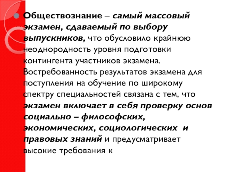 Слайд 3Обществознание – самый массовый экзамен, сдаваемый по выбору выпускников, что обусловило