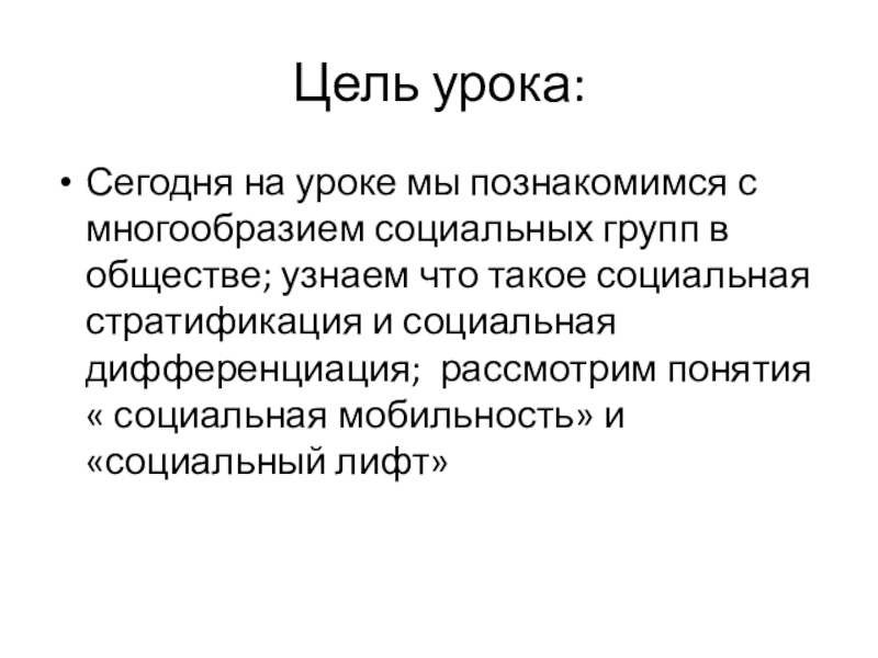 обществе; узнаем что такое социальная стратификация и социальная дифференциация; рассмотрим понятия « социальная мобильность» и «социальный лифт»