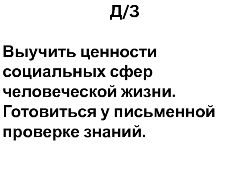 Выучить ценности социальных сфер человеческой жизни. Готовиться у письменной проверке знаний.