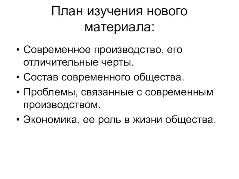 План изучения нового материала:Современное производство, его отличительные черты.Состав современного общества.Проблемы, связанные с современным производством.Экономика, ее роль в