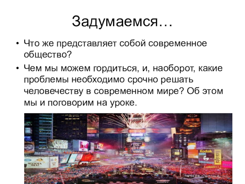 Задумаемся…Что же представляет собой современное общество? Чем мы можем гордиться, и, наоборот, какие проблемы необходимо срочно решать