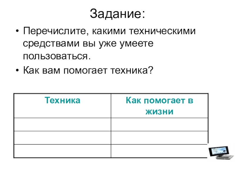 Задание: Перечислите, какими техническими средствами вы уже умеете пользоваться. Как вам помогает техника?