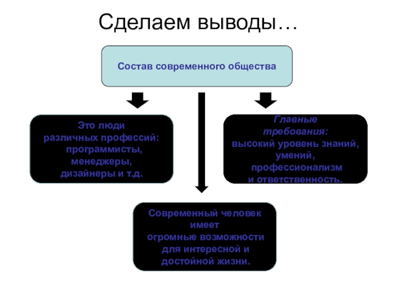 Сделаем выводы…Состав современного обществаЭто люди различных профессий: программисты, менеджеры, дизайнеры и т.д.Главные требования:высокий уровень знаний,умений, профессионализм и