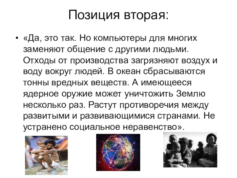 Позиция вторая:«Да, это так. Но компьютеры для многих заменяют общение с другими людьми. Отходы от производства загрязняют