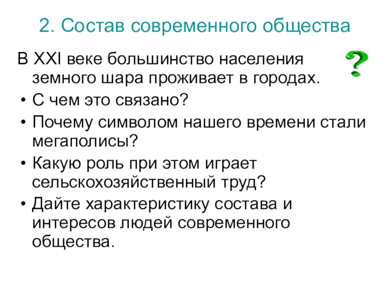 2. Состав современного обществаВ ХХI веке большинство населения земного шара проживает в городах. С чем это связано?Почему