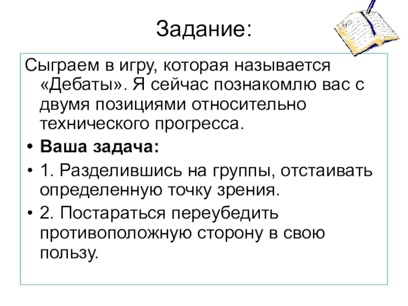 Задание: Сыграем в игру, которая называется «Дебаты». Я сейчас познакомлю вас с двумя позициями относительно технического прогресса.