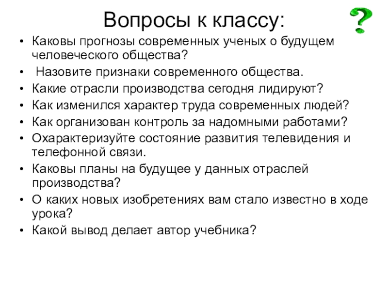 Вопросы к классу: Каковы прогнозы современных ученых о будущем человеческого общества? Назовите признаки современного общества.Какие отрасли производства
