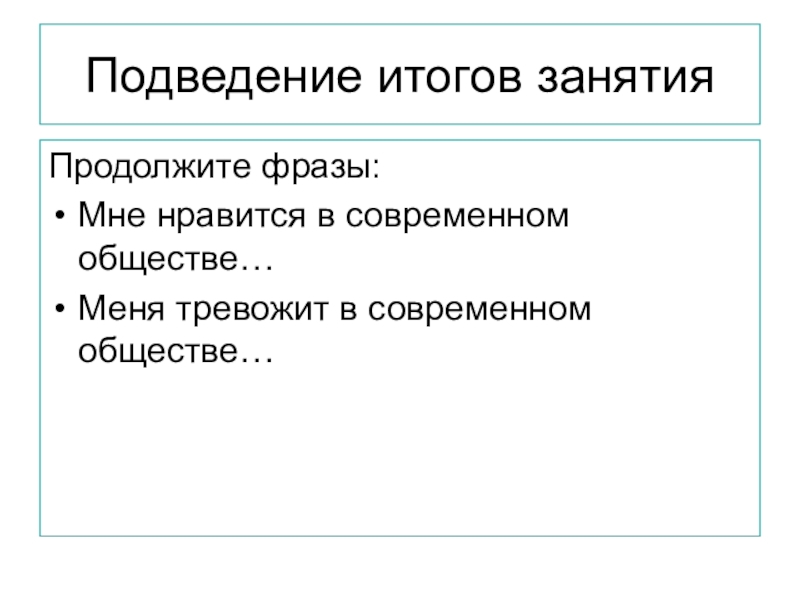 Подведение итогов занятияПродолжите фразы: Мне нравится в современном обществе…Меня тревожит в современном обществе…