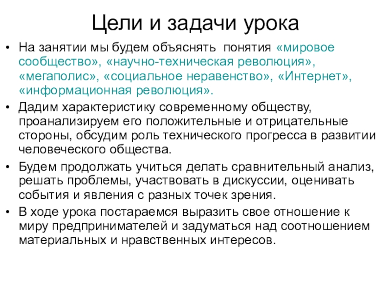 Цели и задачи урокаНа занятии мы будем объяснять понятия «мировое сообщество», «научно-техническая революция», «мегаполис», «социальное неравенство», «Интернет»,