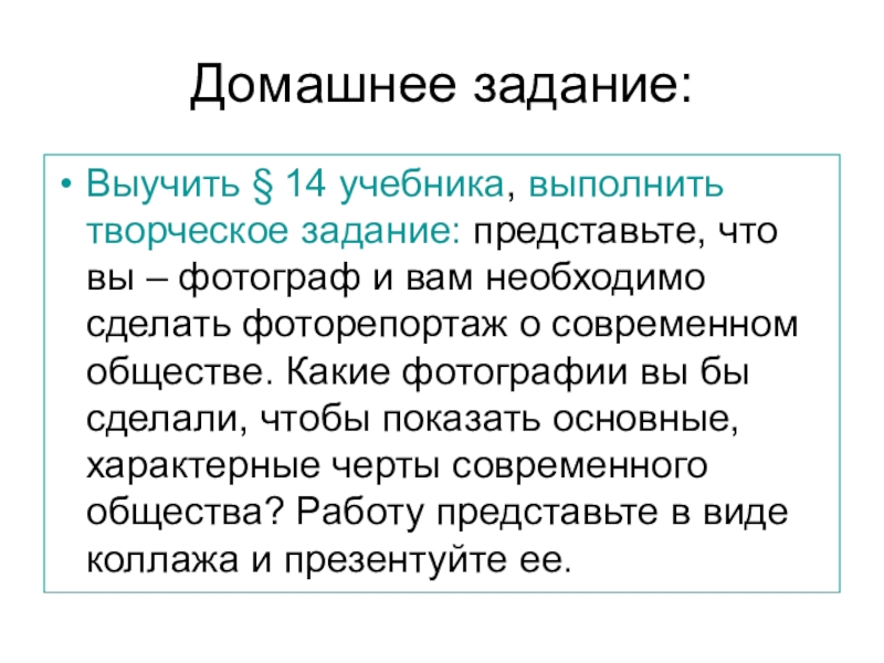 вы – фотограф и вам необходимо сделать фоторепортаж о современном обществе. Какие фотографии вы бы сделали, чтобы показать основные, характерные черты современного общества? Работу представьте в виде коллажа и презентуйте ее.