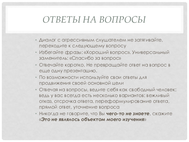 Отвечая на вопросы, ведите себя как свободный человек: ведь у вас всегда есть несколько вариантов: вежливый отказ, отсрочка ответа, переформулирование ответа, прямой ответ, уточнение вопроса
