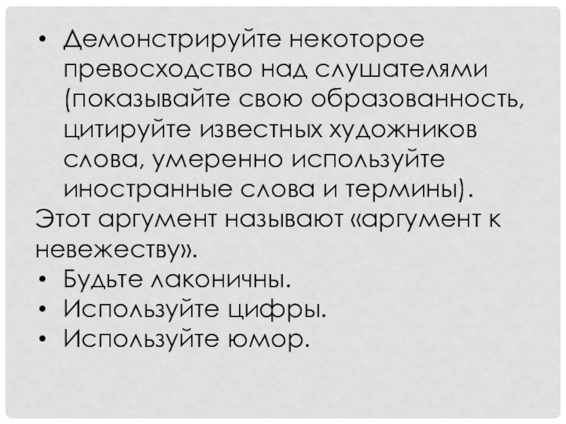 Слайд 20Демонстрируйте некоторое превосходство над слушателями (показывайте свою образованность, цитируйте известных художников