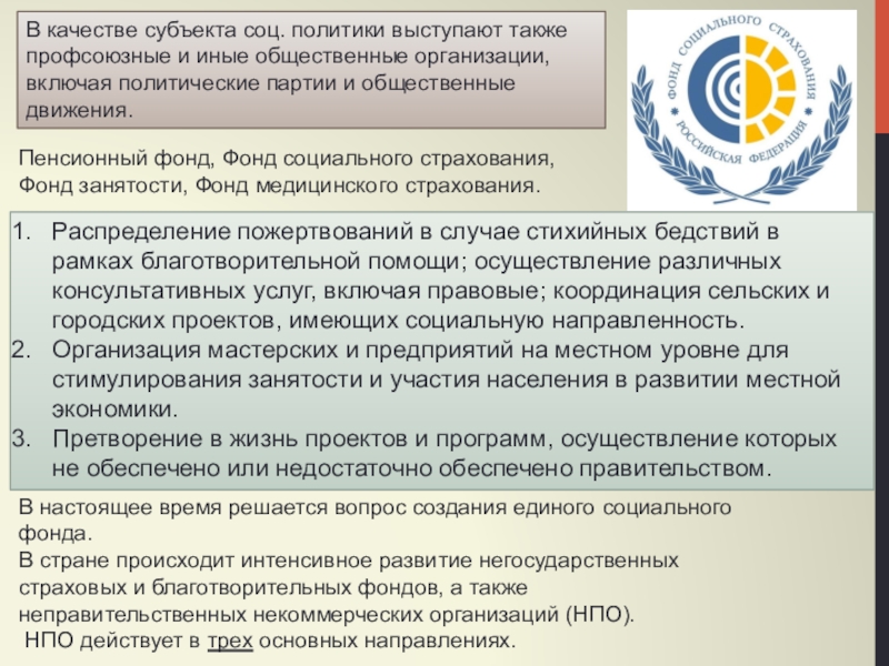 В качестве субъекта соц. политики выступают также профсоюзные и иные общественные организации, включая политические партии и общественные движения.
