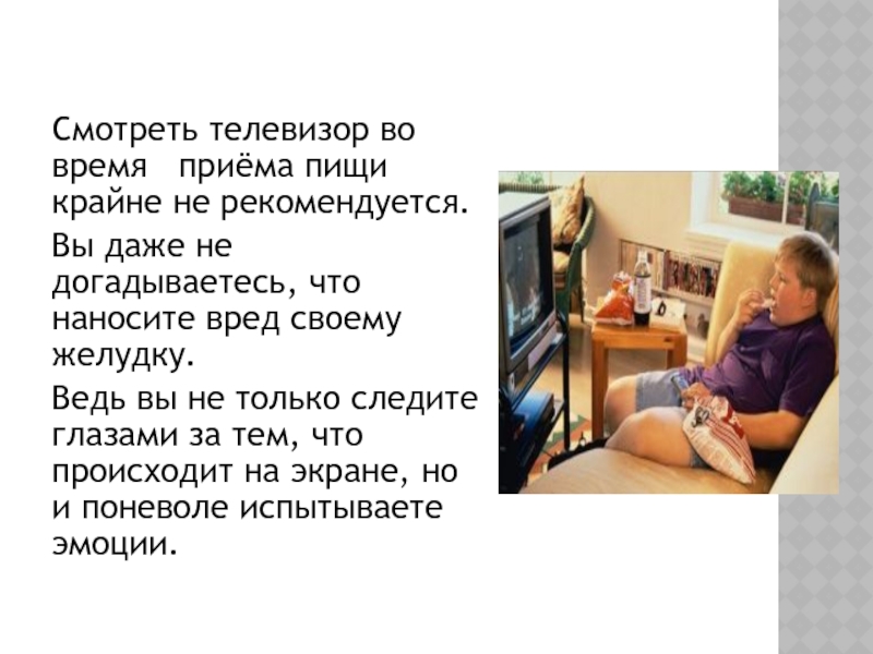 Слайд 12Смотреть телевизор во время приёма пищи крайне не рекомендуется.