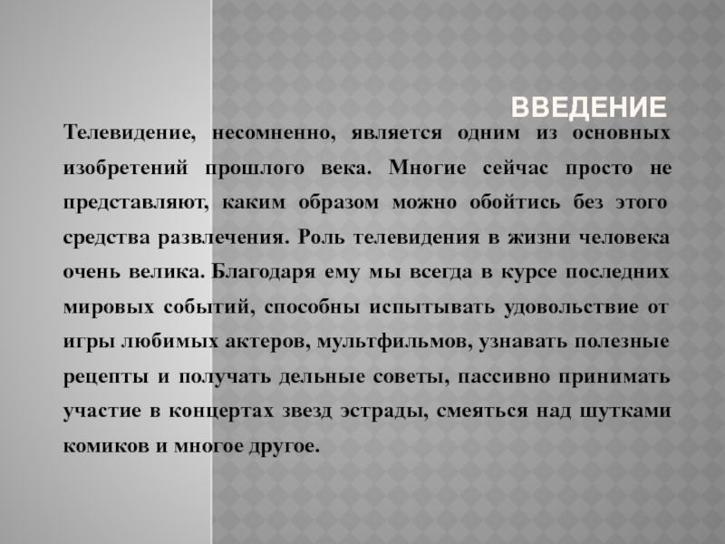 просто не представляют, каким образом можно обойтись без этого средства развлечения. Роль телевидения в жизни человека очень велика. Благодаря ему мы всегда в курсе последних мировых событий, способны испытывать удовольствие от игры любимых актеров, мультфильмов, узнавать полезные рецепты и получать дельные советы, пассивно принимать участие в концертах звезд эстрады, смеяться над шутками комиков и многое другое.