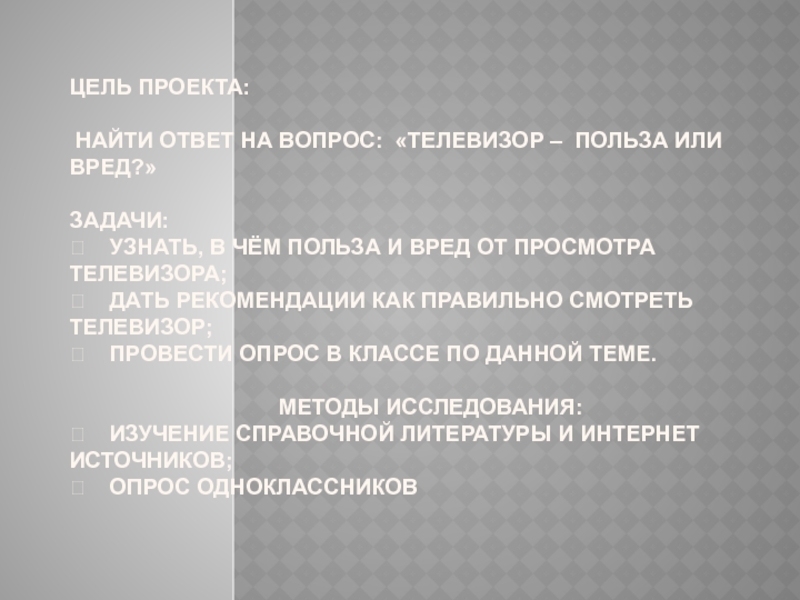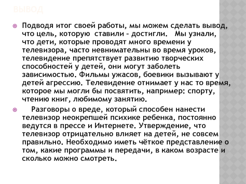 ставили – достигли. Мы узнали, что дети, которые проводят много времени у телевизора, часто невнимательны во время уроков, телевидение препятствует развитию творческих способностей у детей, они могут заболеть зависимостью. Фильмы ужасов, боевики вызывают у детей агрессию. Телевидение отнимает у нас то время, которое мы могли бы посвятить, например: спорту, чтению книг, любимому занятию.
