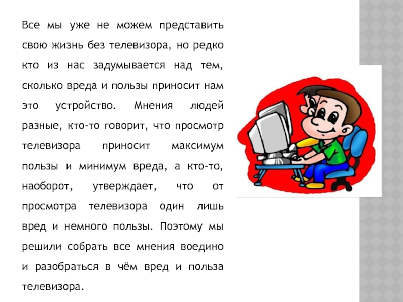 редко кто из нас задумывается над тем, сколько вреда и пользы приносит нам это устройство. Мнения людей разные, кто-то говорит, что просмотр телевизора приносит максимум пользы и минимум вреда, а кто-то, наоборот, утверждает, что от просмотра телевизора один лишь вред и немного пользы. Поэтому мы решили собрать все мнения воедино и разобраться в чём вред и польза телевизора.