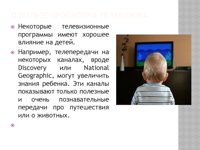 Например, телепередачи на некоторых каналах, вроде Discovery или National Geographic, могут увеличить знания ребенка. Эти каналы показывают только полезные и очень познавательные передачи про путешествия или о животных.