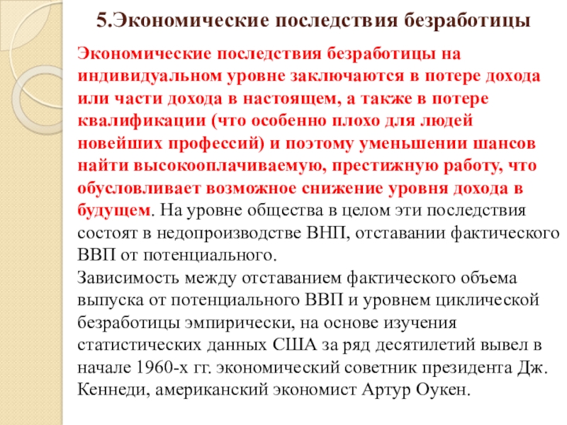 дохода или части дохода в настоящем, а также в потере квалификации (что особенно плохо для людей новейших профессий) и поэтому уменьшении шансов найти высокооплачиваемую, престижную работу, что обусловливает возможное снижение уровня дохода в будущем. На уровне общества в целом эти последствия состоят в недопроизводстве ВНП, отставании фактического ВВП от потенциального.