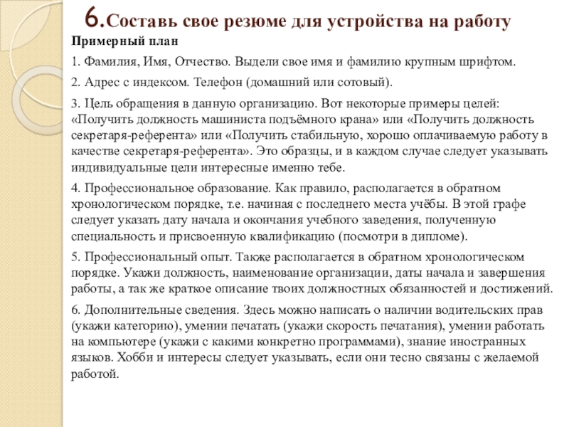 6. Дополнительные сведения. Здесь можно написать о наличии водительских прав (укажи категорию), умении печатать (укажи скорость печатания), умении работать на компьютере (укажи с какими конкретно программами), знание иностранных языков. Хобби и интересы следует указывать, если они тесно связаны с желаемой работой.