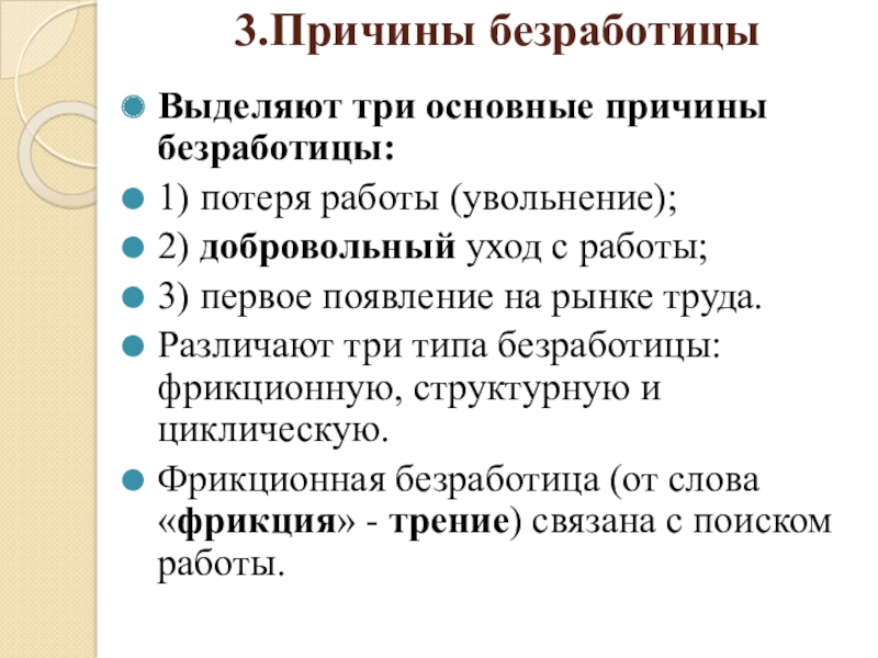 Различают три типа безработицы: фрикционную, структурную и циклическую.