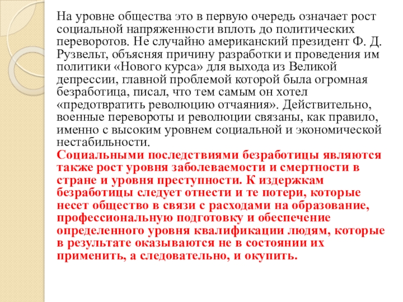 вплоть до политических переворотов. Не случайно американский президент Ф. Д. Рузвельт, объясняя причину разработки и проведения им политики «Нового курса» для выхода из Великой депрессии, главной проблемой которой была огромная безработица, писал, что тем самым он хотел «предотвратить революцию отчаяния». Действительно, военные перевороты и революции связаны, как правило, именно с высоким уровнем социальной и экономической нестабильности.