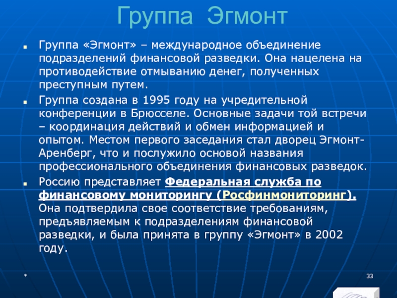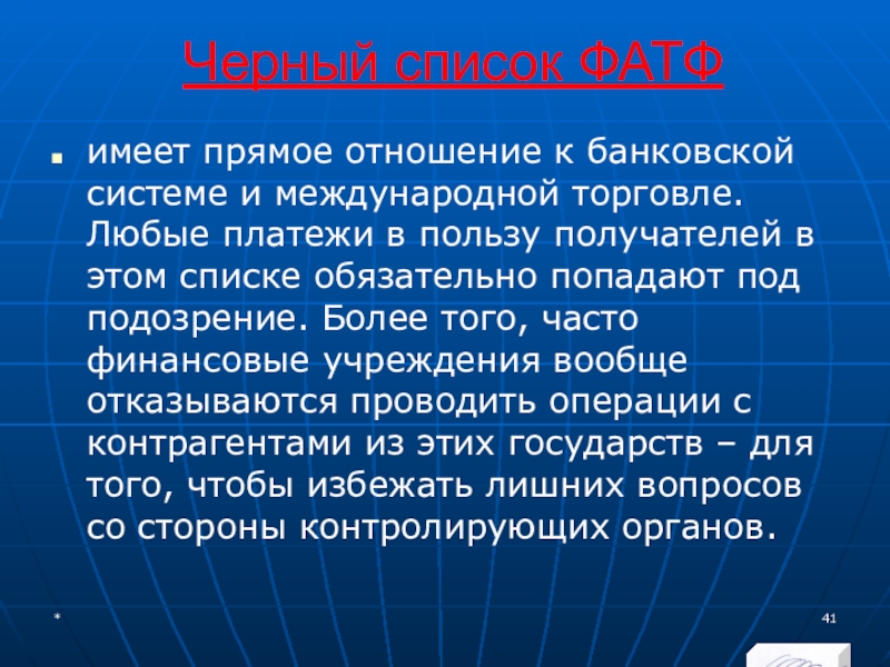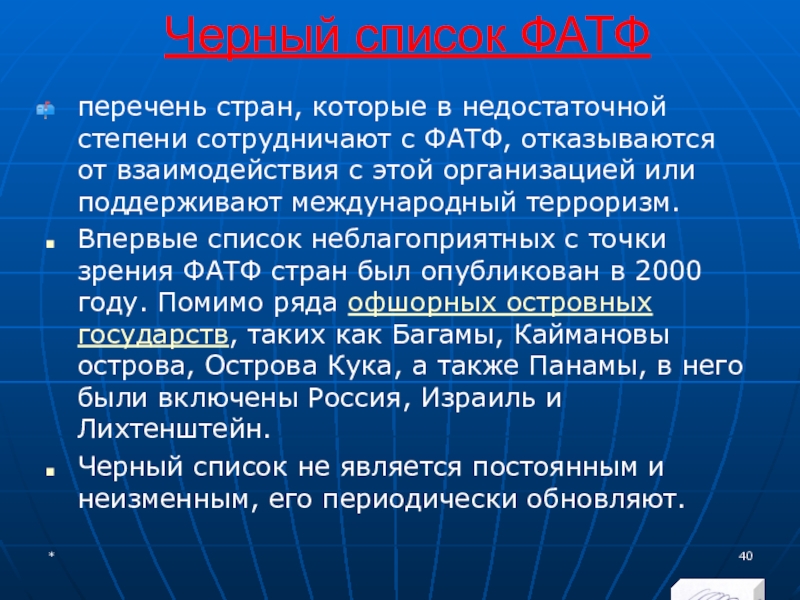 межправительственная организация, в задачи которой входит выработка международных стандартов по противодействию легализации преступных доходов. Кроме того, ФАТФ занимается оценкой законодательства и национальных стандартов в этой области и их соответствия принятым международным нормам.