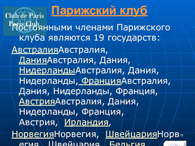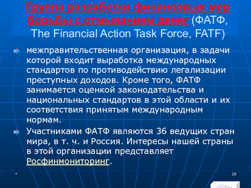 Участниками ФАТФ являются 36 ведущих стран мира, в т. ч. и Россия. Интересы нашей страны в этой организации представляет Росфинмониторинг.