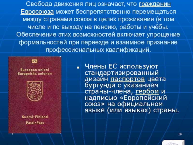 Члены ЕС используют стандартизированный дизайн паспортов цвета бургунди с указанием страны-члена, гербом и надписью «Европейский союз» на официальном языке (или языках) страны.