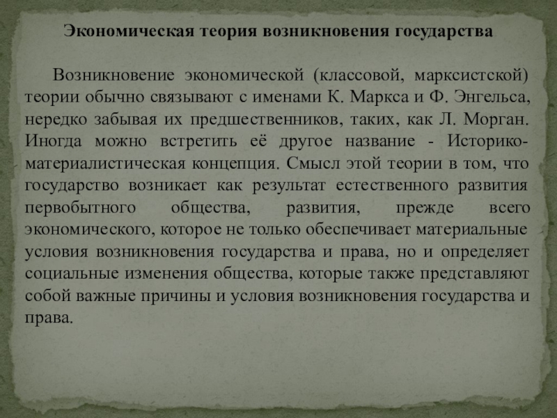 теории обычно связывают с именами К. Маркса и Ф. Энгельса, нередко забывая их предшественников, таких, как Л. Морган. Иногда можно встретить её другое название - Историко-материалистическая концепция. Смысл этой теории в том, что государство возникает как результат естественного развития первобытного общества, развития, прежде всего экономического, которое не только обеспечивает материальные условия возникновения государства и права, но и определяет социальные изменения общества, которые также представляют собой важные причины и условия возникновения государства и права.