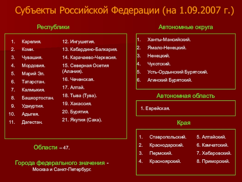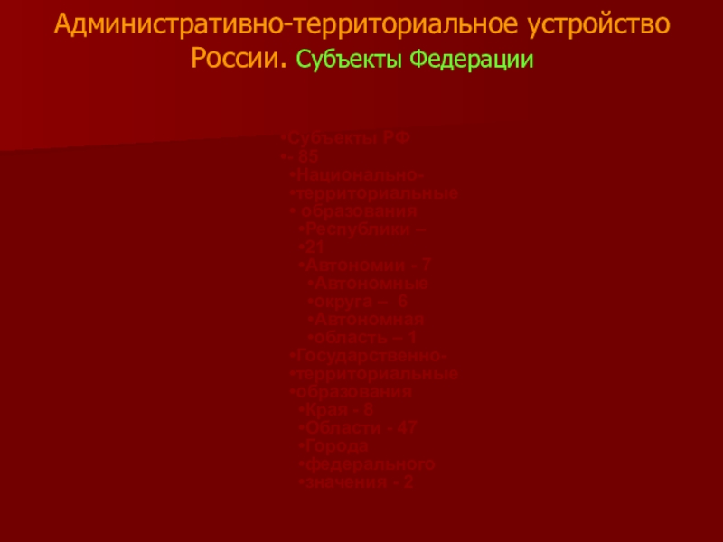 Примеры административно-территориальных единиц (субъектов) Российской Федерации - республика, автономный округ, автономная область. край, область, город федерального значения.