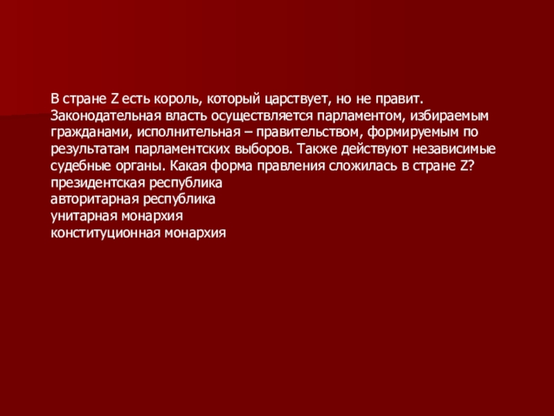 Государство, в котором законода- тельная и исполни- тельная власть поделены между президентом и парламентом.