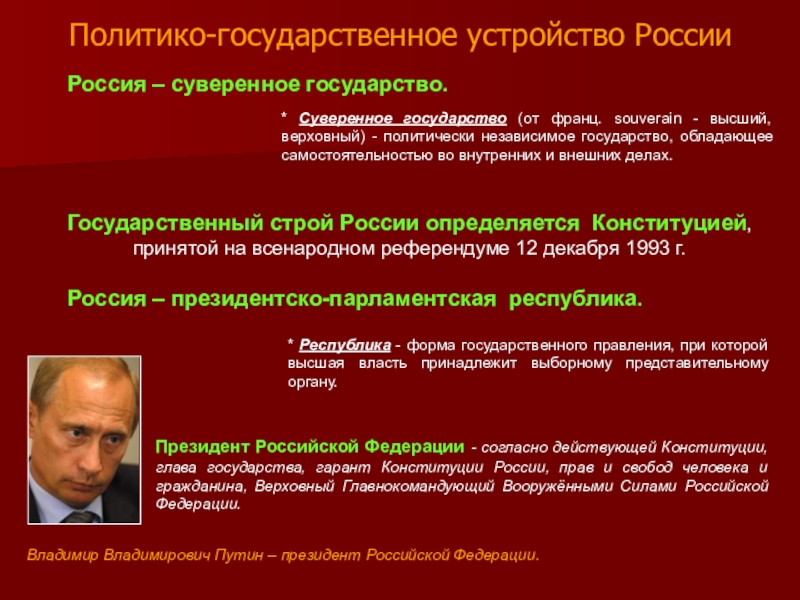 Государственный строй России определяется Конституцией, принятой на всенародном референдуме 12 декабря 1993 г.