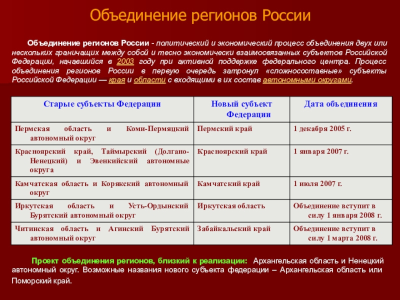 Проект объединения регионов, близкий к реализации: Архангельская область и Ненецкий автономный округ. Возможные названия нового субъекта федерации – Архангельская область или Поморский край.