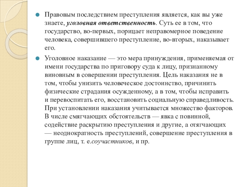 Слайд 13Правовым последствием преступления является, как вы уже знаете, уголовная ответственность. Суть ее
