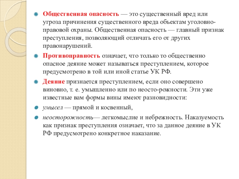 неосторожность— легкомыслие и небрежность. Наказуемость как признак преступления означает, что за данное деяние в УК РФ предусмотрено конкретное наказание.